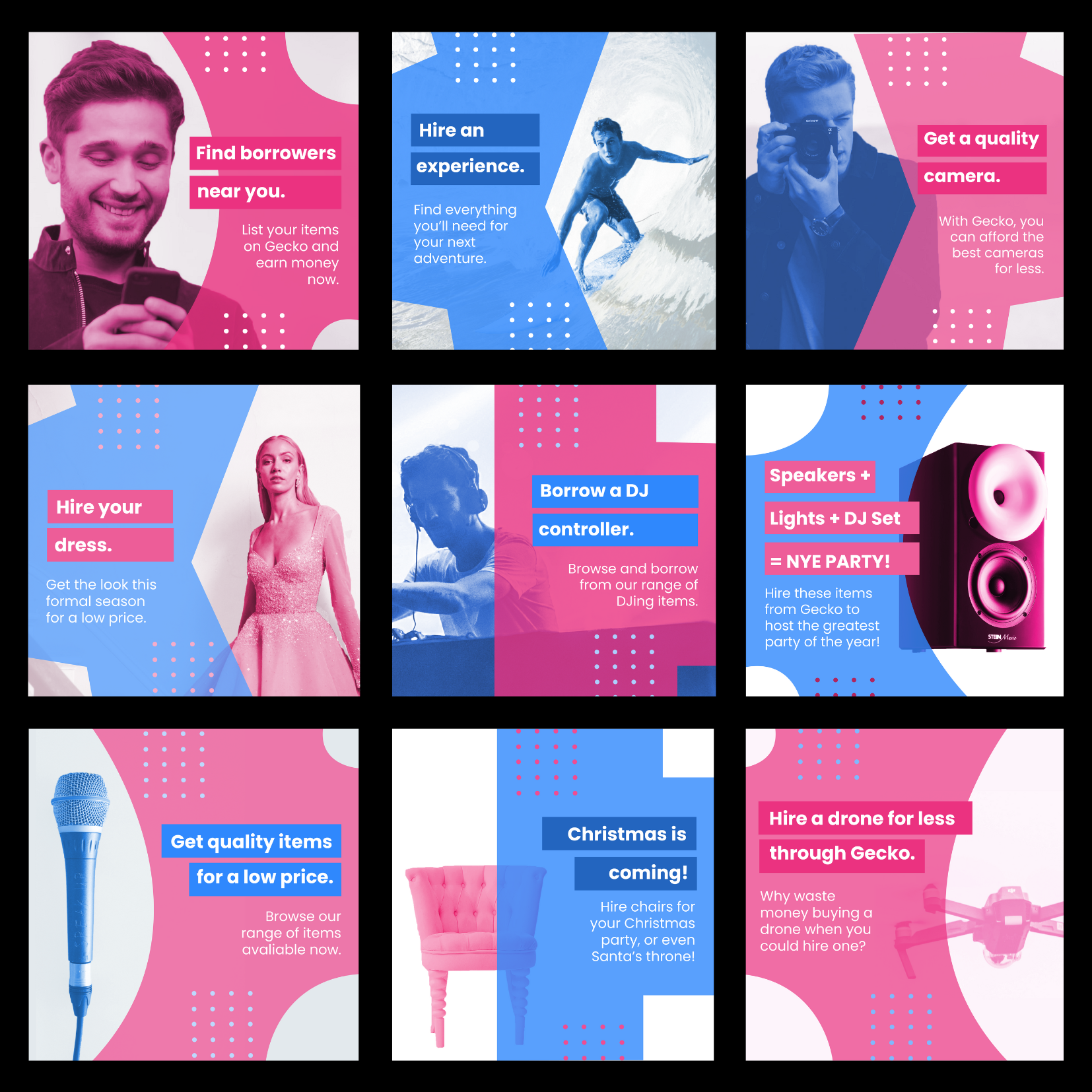 At the time I worked there, Gecko (Gecko.rent) was an event rental business. It allowed users to list items they own online, and these items could be rented by others for parties or events - items such as chairs, cameras, lights and DJ equipment. It was a Sydney-based tech startup, but has since moved to San Francisco. Throughout my graphic design internship at Gecko, I developed and designed a range of digital marketing collateral, with a focus on social media and flyer content.